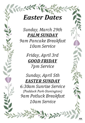 We are having a Financial Peace University class by Dave Ramsey on Sunday evenings from 5:30pm to 7pm in the fellowship hall. This is a great class to gain financial tools for a successful future. If you are interested in attending, please contact Scott Hurley at 860-460-0947.
