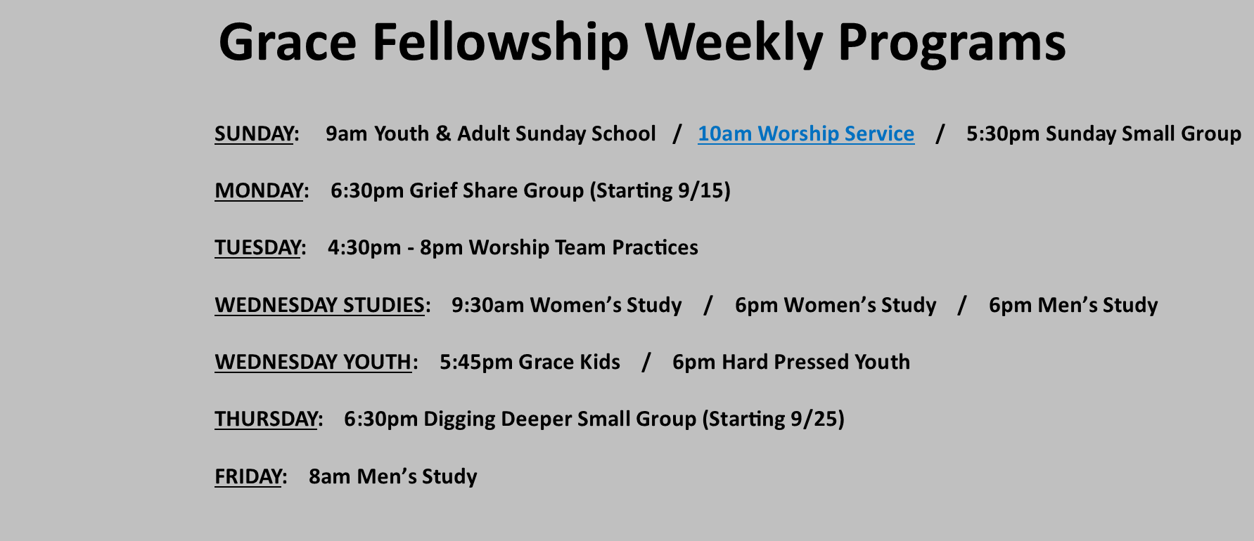 At Grace Fellowship, you will find different ways to worship, grow, and fellowship with others in small communities and classes.